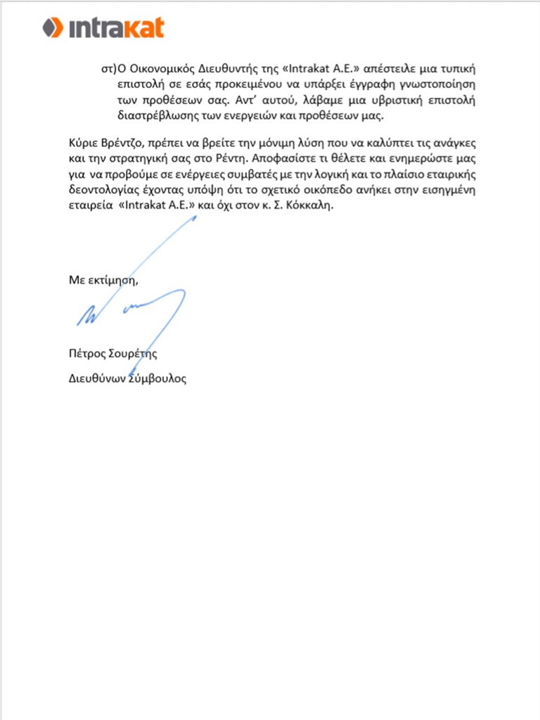 Επιστολή της Intrakat στον Γιάννη Βρέντζο