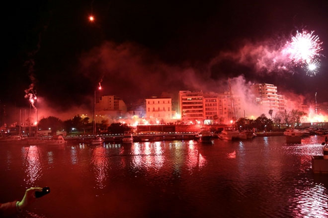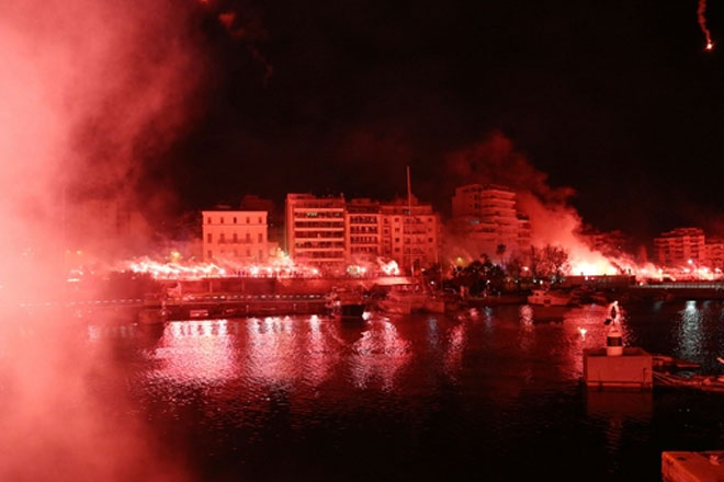 Ετσι, δημιούργησαν ένα εντυπωσιακό θέαμα, το οποίο συνοδεύτηκε από συνθήματα υπέρ του Ολυμπιακού και τον ύμνο της ομάδας, που μέσα σε αυτά τα 90 χρόνια ζωής κατέκτησε τους περισσότερους τίτλους και λειτουργεί σε υψηλό επίπεδο όλα τα αθλητικά τμήματα που διαθέτει.