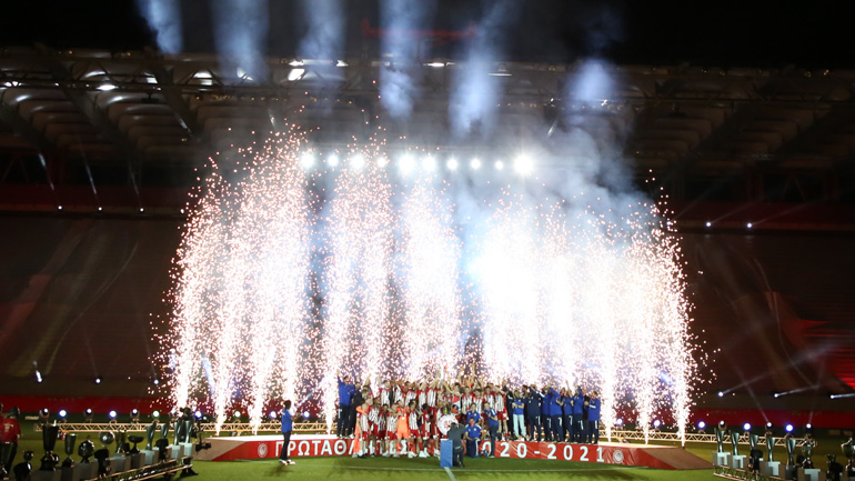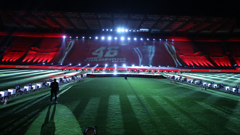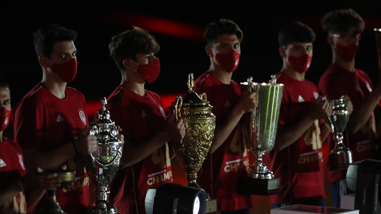 Οι «ερυθρόλευκοι» κατέκτησαν με χαρακτηριστική άνεση τον τίτλο της σεζόν 2020/21 και απόψε έγινε η απονομή του τροπαίου, το οποίο σήκωσαν στον ουρανό του Πειραιά, μέσα σε πανηγυρικό κλίμα.