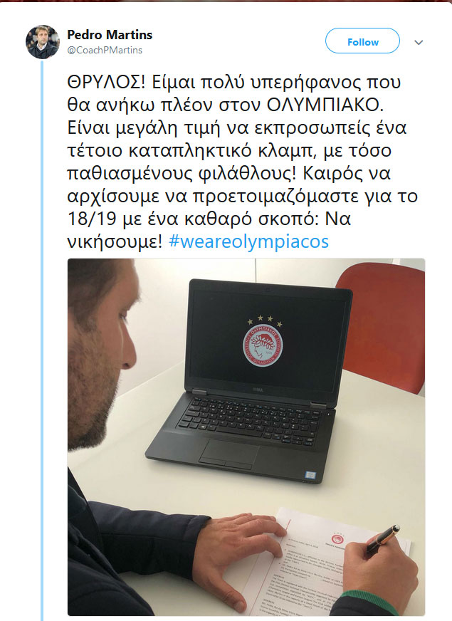Το πρώτο του μήνυμα -και μάλιστα στα ελληνικά- έστειλε στους οπαδούς του Ολυμπιακού ο Πέδρο Μαρτίνς μέσω Twitter, λίγα λεπτά μετά την ανακοίνωση της συνεργασίας με τους «ερυθρόλευκους».