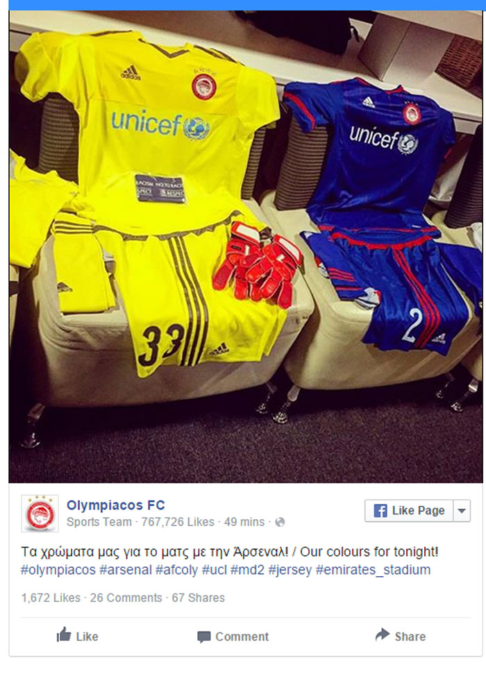 Σε ποστάρισμά του στα social media ο Ολυμπιακός γνωστοποίησε πως θα αντιμετωπίσει την Άρσεναλ με τα μπλε χρώματα της δεύτερης εμφάνισής του, ενώ ο τερματοφύλακας της ομάδας, Ρομπέρτο, θα παίξει με κίτρινη φανέλα και κόκκινα γάντια.
