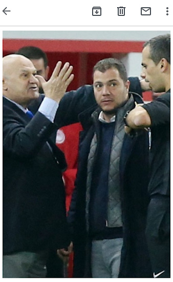 Ο Βαγγέλης Μπαλόκας ακολούθησε κι αυτός το κλίμα που καλλιέργησε η διοίκηση του Ολυμπιακού και στη φωτογραφία φαίνεται να τα… χώνει ως θερμόαιμος οπαδός στον διαιτητή Πέτρο Τσαγκαράκη!