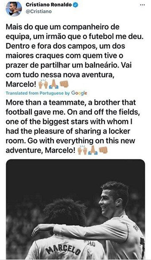 «Πάνω από ένας συμπαίκτης, ένας αδερφός που μου έδωσε το ποδόσφαιρο. Μέσα και έξω από τα γήπεδα, ένας από τους μεγαλύτερους σταρ που είχα την ευχαρίστηση να μοιράζομαι τα ίδια αποδυτήρια. Σου εύχομαι τα καλύτερα σε αυτή τη νέα περιπέτεια, Μαρσέλο», έγραψε χαρακτηριστικά ο «CR7».