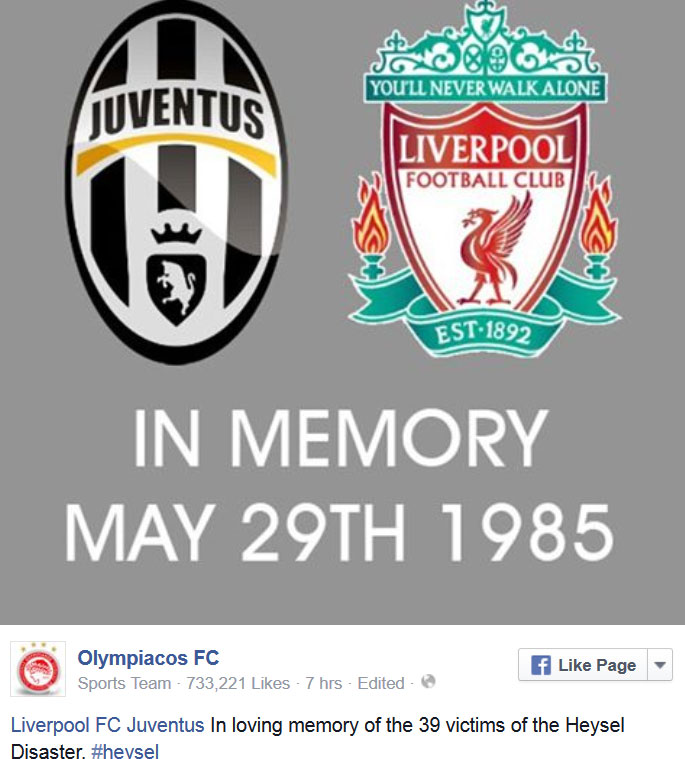 Tριάντα χρόνια συμπληρώθηκαν σήμερα από την ποδοσφαιρική τραγωδία στο Χέιζελ, με την ΠΑΕ Ολυμπιακός να αναρτά μια φωτογραφία στο Facebook, η οποία συνοδευόταν από το εξής μήνυμα: «Εις ανάμνηση της 29ης Μαΐου 1985».