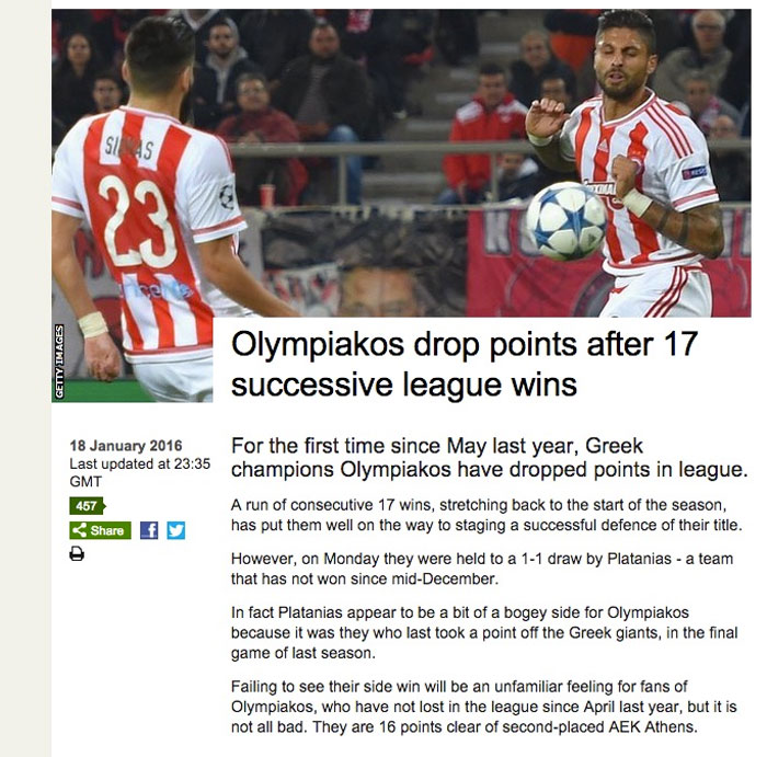 Σύμφωνα με το ρεπορτάζ η απώλεια βαθμών αποτελεί πρωτοφανή αίσθηση για τους φίλους του Ολυμπιακού, μιας και η ομάδα τους δεν έχει χάσει στο πρωτάθλημα τη φετινή σεζόν, ενώ χαρακτηρίζει τον Πλανανιά ως «κακό δαίμονα» των πρωταθλητών Ελλάδας, μιας και ήταν η ομάδα που απέσπασε ισοπαλία από τους «ερυθρολεύκους» στο τελευταίο ματς πρωταθλήματος της περσινής σεζόν.