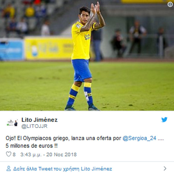 Πιο συγκεκριμένα ο εν λόγω δημοσιογράφος έγραψε στο Twitter πως οι «ερυθρόλευκοι» έκαναν πρόταση πέντε εκατομμυρίων ευρώ για τον πρώην παίκτη της «Ένωσης», ο οποίος ως γνωστόν επέστρεψε το καλοκαίρι στη Λας Πάλμας υπογράφοντας νέο συμβόλαιο μέχρι το 2023.