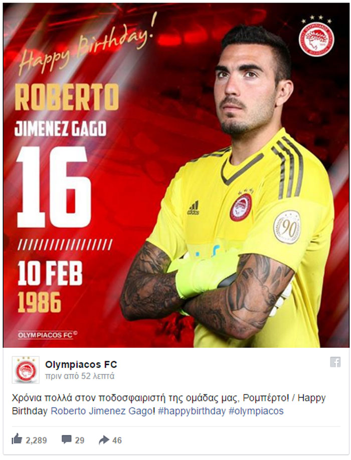 Τα 30 του χρόνια κλείνει σήμερα ο Ρομπέρτο, ο οποίος γεννήθηκε στις 10 Φεβρουαρίου του 1986. Στον Ολυμπιακό σαφώς δεν ξέχασαν τον Ισπανό τερματοφύλακα...