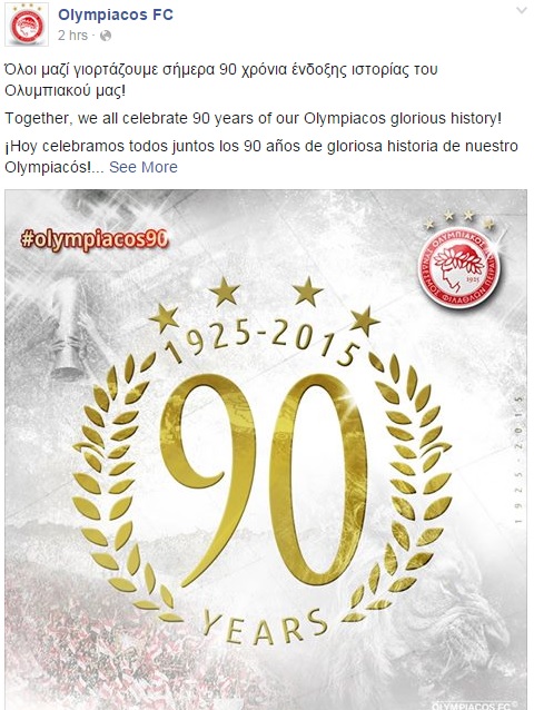 H ΠΑΕ Ολυμπιακός μέσω του facebook έστειλε μήνυμα στον κόσμο της ομάδας για την συμπλήρωση των 90 ετών ζωής του συλλόγου. Με φωτογραφία το επετειακό λογότυπο των 90 χρόνων το μήνυμα των Πειραιωτών αναφέρει: