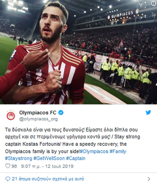 Η ομάδα του Πειραιά την Παρασκευή έστειλε μήνυμα στήριξης προς τον διεθνή άσο, με ανάρτηση στα μέσα κοινωνικής δικτύωσης, αναφέροντας χαρακτηριστικά: «Tα δύσκολα είναι για τους δυνατούς! Είμαστε όλοι δίπλα σου αρχηγέ και σε περιμένουμε γρήγορα κοντά μας!».