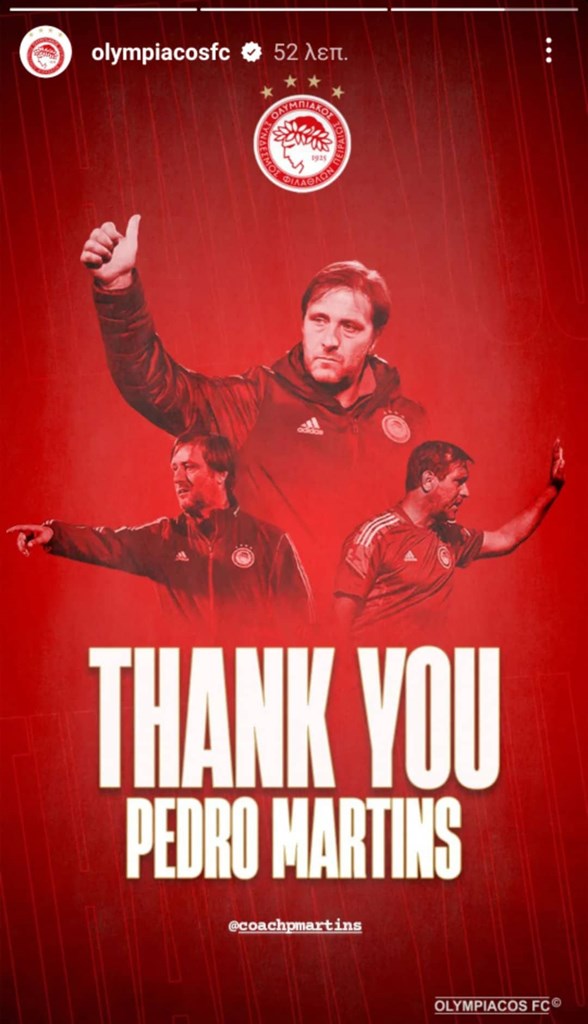 Οι «ερυθρόλευκοι» μετά την επισημοποίηση της συνεργασίας τους με τον Ισπανό τεχνικό έκαναν γνωστή και το τέλος της συνεργασίας τους με τον Πορτογάλο, τον οποίο ευχαρίστησαν μέσω ενός story.