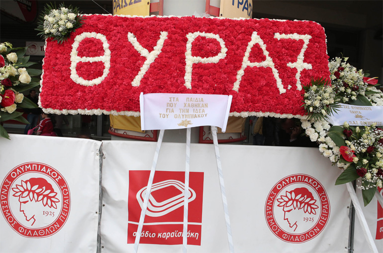 Πλήθος κόσμου συγκεντρώθηκε στο γήπεδο Καραϊσκάκη. Από νωρίς το μεσημέρι του Σαββάτου. Οι φίλοι της ομάδας μας κρέμασαν τα πανό τους, πανό τα οποία έστελναν τα δικά τους μηνύματα: «Δεν φύγατε ποτέ από κοντά μας»… «Θρύλε θυμήσου, πρωταθλητή σε θέλουνε ακόμα και οι νεκροί σου»… «Αδέρφια ζείτε, εσείς μας οδηγείτε»… Αλλά και ένα μεγάλο πανό, με ζωγραφισμένα τα 21 παιδιά μας!