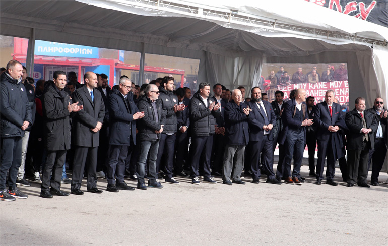 Μετά το πέρας της επιμνυμόσυνης δέησης, την οποία τέλεσε ο Μητροπολίτης Πειραιώς και Φαλήρου, Σεβασμιότατος κ.κ. Σεραφείμ, ακολούθησε η κατάθεση στεφάνων στο μνημείο του Δήμου Πειραιά, απέναντι από το γήπεδο Καραϊσκάκη. Ο ηγέτης του Ολυμπιακού, κ. Μαρινάκης, στάθηκε δίπλα στον Δήμαρχο Πειραιά, κ. Γιάννη Μώραλη και άκουσαν με προσοχή τον πύρινο λόγο του προέδρου της ΠΕΦΟ, κ. Κώστα Μπαρμπή, ο οποίος όπως πάντα, συγκίνησε.