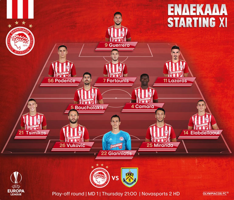 Ολυμπιακός: Γιαννιώτης, Ελαμπντελαουί, Τσιμίκας, Βούκοβιτς, Ρόντερικ, Καμαρά, Μπουχαλάκης, Χριστοδουλόπουλος (84’ Ανσαριφάρντ), Ποντένσε, Φορτούνης (88’ Φετφατζίδης), Γκερέρο.