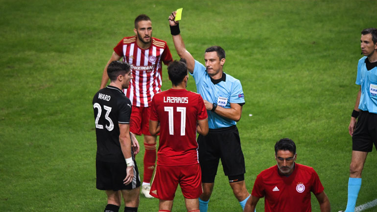 Κίτρινες: Μπουχαλάκης (Ολυμπιακός), Χριστοδουλόπουλος (Ολυμπιακός), Γκούντμουντσον (Μπέρνλι), Γουόρντ (Μπέρνλι), Γκίμπσον (Μπέρνλι), Τέιλορ (Mπέρνλι)