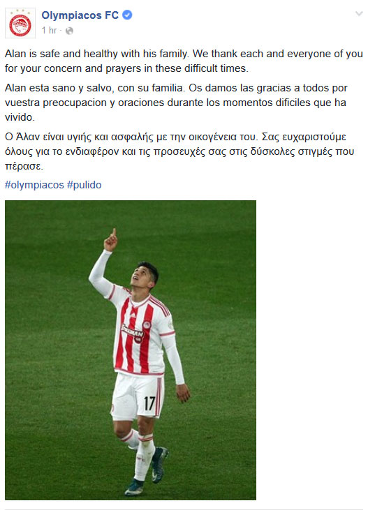 Μάλιστα η ερυθρόλευκη ΠΑΕ δεν παρέλειψε να τοποθετηθεί για την αίσια έκβαση που είχε η περιπέτεια του Μεξικανού διεθνούς στράικερ, ευχαριστώντας άπαντες για τα μηνύματα συμπαράστασης που έλαβε, με αφορμή τη συγκεκριμένη υπόθεση.
