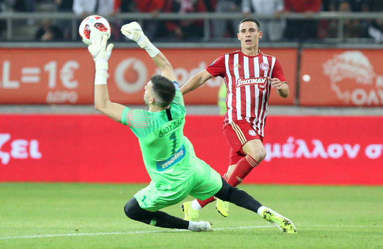 38′ Μεγάλη ευκαιρία για τον Ολυμπιακό. Ο Φορτούνης συνεργάστηκε με τον Ποντένσε, αλλά ο Πορτογάλος δεν μπόρεσε να νικήσει τον Διούδη.