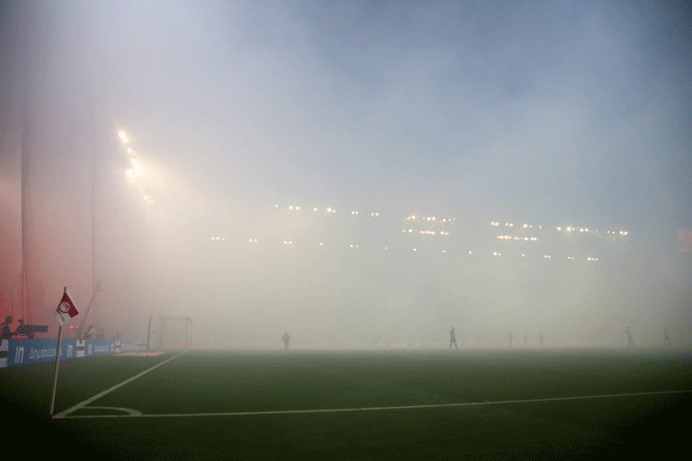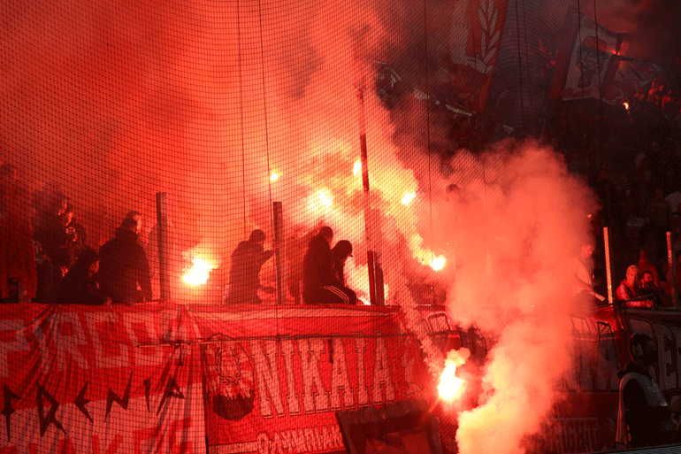 Το ματς ξεκίνησε επί της ουσίας με οκτώ λεπτά καθυστέρηση λόγω της… ομίχλης που δημιουργήθηκε από τα καπνογόνα που άναψαν οι οπαδοί του Ολυμπιακού. Παρόμοιο σκηνικό καταγράφηκε και στην έναρξη του δευτέρου μέρους.