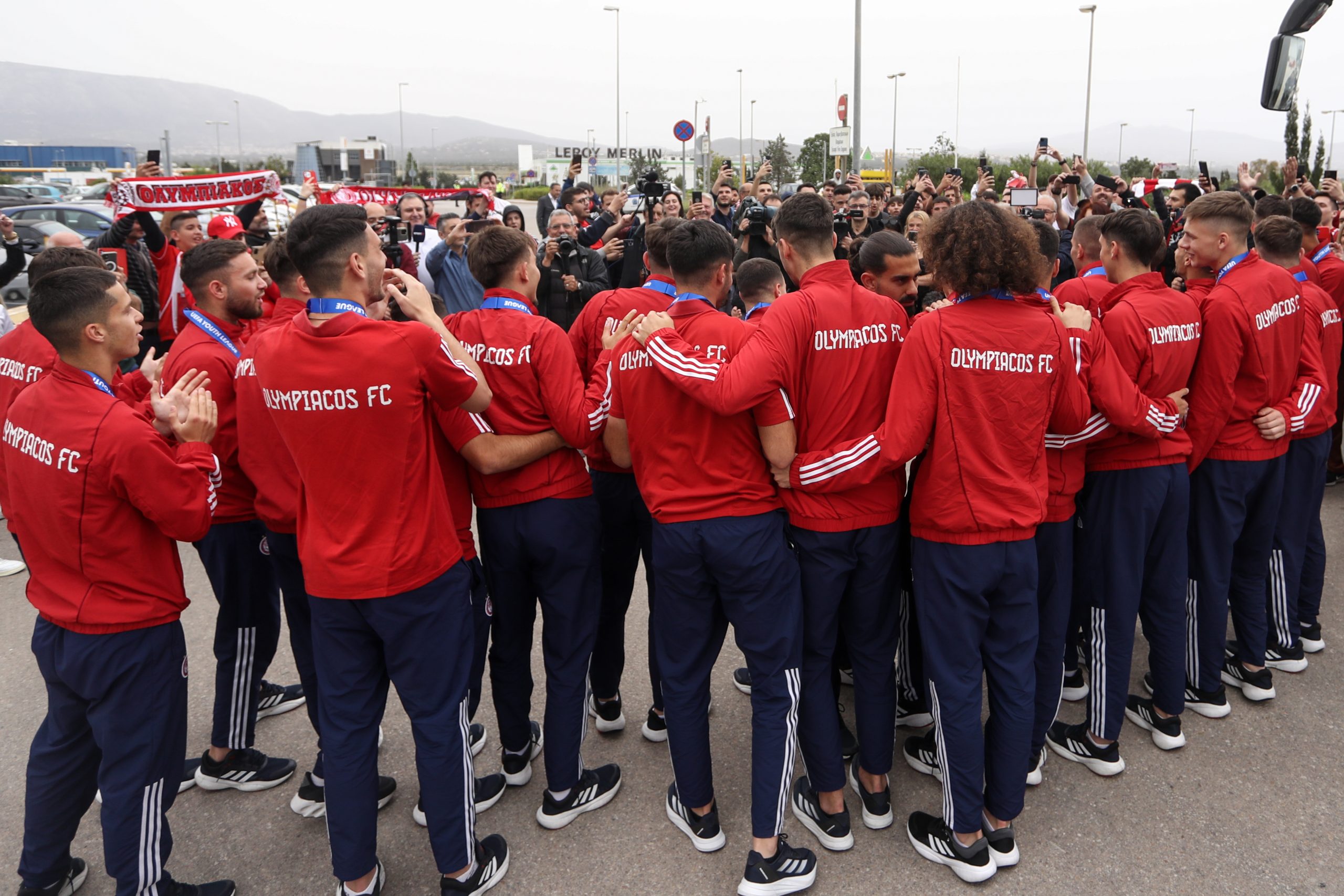 Η αποστολή επέστρεψε μέσω Γενεύης το μεσημέρι της Τρίτης κι έγινε δεκτή με ενθουσιασμό και πολλά συνθήματα από τους δεκάδες φίλους του Ολυμπιακού.