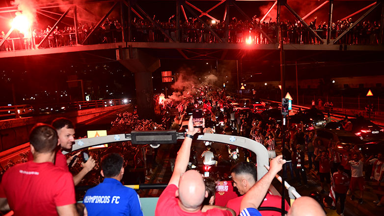 Παράλληλα εκατοντάδες μηχανάκια συνόδευσαν το πούλμαν του Ολυμπιακού μέχρι το Δημοτικό θέατρο φωνάζοντας συνθήματα, ενώ οι ποδοσφαιριστές του Ολυμπιακού γνώρισαν την αποθέωση από κόσμο που είχε μαζευτεί στις γέφυρες από όπου περνούσε η αποστολή της ομάδας!