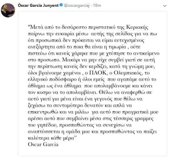 Για πρώτη φορά από την στιγμή που δέχθηκε το ρολό του χαρτιού ταμειακής στο πρόσωπο, στο γήπεδο της Τούμπας, εξέφρασε την δική του άποψη ο Όσκαρ Γκαρθία. Το έκανε με ανάρτηση στον προσωπικό λογαριασμό του στο Twitter και, όπως τόνισε ο προπονητής του Ολυμπιακού, χαμένοι από αυτή την ιστορία βγήκαν όλοι. Έγραψε συγκεκριμένα: