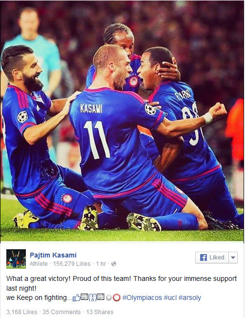 Ο Παϊτίμ Κασάμι μετά τη νίκη του Ολυμπιακού επί της Άρσεναλ στο Λονδίνο έστειλε το δικό του μήνυμα μέσω του facebook. Ο Ελβετός μέσος των «ερυθρόλευκων» ανέφερε: