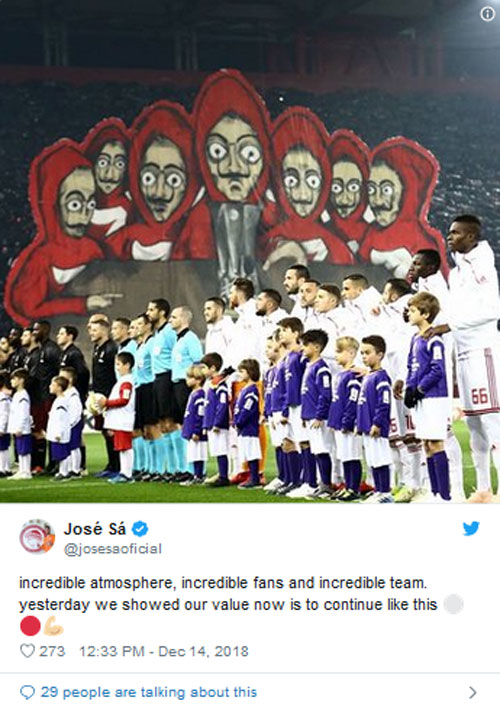 Το εγκώμιο των φιλάθλων του Ολυμπιακού για την εκπληκτική ατμόσφαιρα που δημιούργησαν στο «Καραϊσκάκη» απέναντι στη Μίλαν έπλεξε ο Ζοσέ Σα, ο οποίος επισημανε παράλληλα ότι η ομάδα του Πειραιά έδειξε την αξία της με τη μεγάλη πρόκριση στους «32» του Europa League.