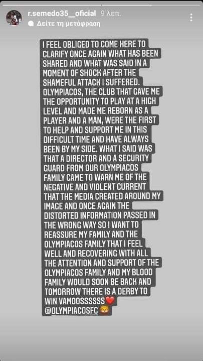 Στη διευκρινιστική δήλωσή του στον λογαριασμό του στο Instagram ο Ρούμπεν Σεμέδο αναφέρει: «Νιώθω την υποχρέωση να ξεκαθαρίσω ξανά αυτό που έχω μοιραστεί και έχει ειπωθεί σε μία κατάσταση σοκ μετά την άθλια επίθεση που δέχθηκα.