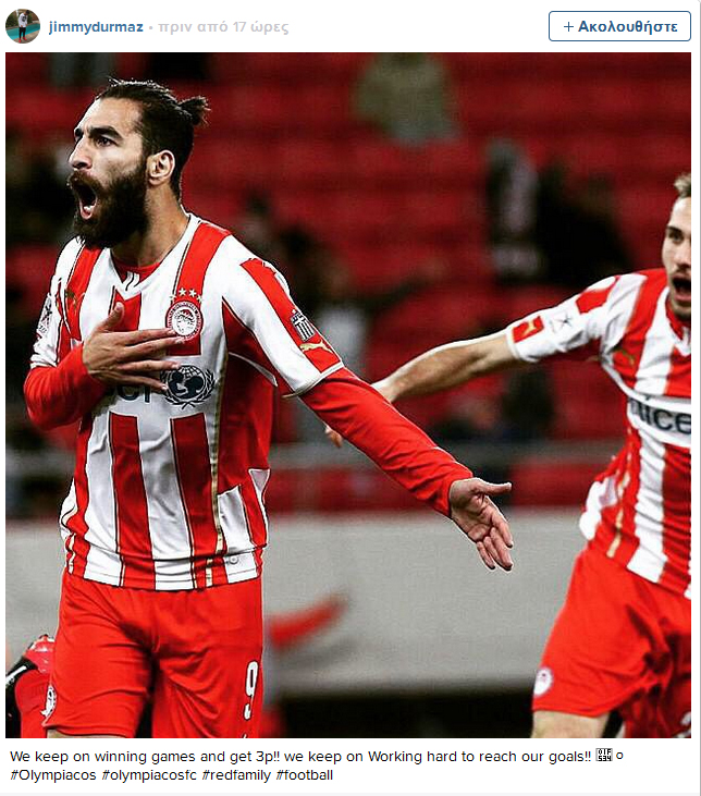 Ο Τζίμι Ντουρμάζ με φωτογραφία στο Ιnstagram τόνισε ότι ο Ολυμπιακός θα δώσει συνέχεια στη σκληρή δουλειά, καθώς παλεύει να πετύχει τους στόχους του. Το μήνυμα του Σουηδού αναφέρει:
