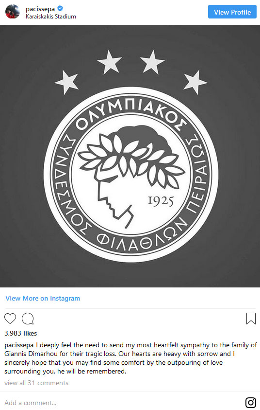 Την οδύνη του για τον χαμό του φιλάθλου του Ολυμπιακού κατά τη διάρκεια του ντέρμπι με τον  Παναθηναϊκό εξέφρασε με μήνυμά του στα social media ο Παπέ Αμπού Σισέ.