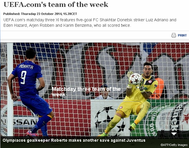 Ο Ισπανός τερματοφύλακας έτσι απολυτά δίκαια συμπεριελήφθη στην καλύτερη ενδεκάδα της 3ης αγωνιστικής του Τσάμπιονς Λιγκ από την UEFA, η οποία στο σχετικό άρθρο στην ιστοσελίδα της τονίζει για τον «φύλακα άγγελο» των «ερυθρόλευκων» ότι: «έπειτα από μία μάλλον… ήσυχη περίοδο ο Ρομπέρτο ήταν ανίκητος ως ο άνθρωπος της τελευταίας γραμμής του Ολυμπιακού απέναντι στις διαρκείς επιθέσεις της Γιουβέντους. Έκανε ουκ ολίγες αξιοσημείωτες επεμβάσεις, συμπεριλαμβανομένου και του σουτ του Μοράτα που πήγε στο δοκάρι στα τελευταία λεπτά».