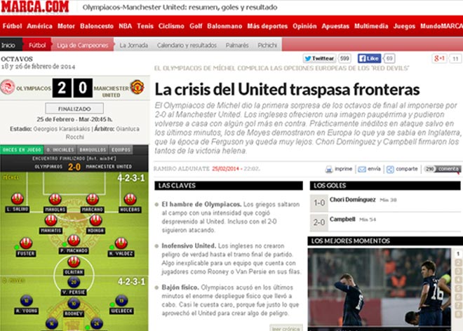 Marca: «Μάντσεστερ Γιουνάιτεντ, η κρίση δεν έχει σύνορα. Ο Ολυμπιακός του Μίτσελ πέρασε πάνω από την Μάντσεστερ Γιουνάιτεντ στο πρώτο σκέλος των 16 του Champions League χάρη σε γκολ των Τσόρι Ντομίνγκες και Κάμπελ».