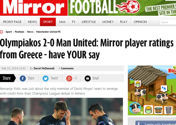 Mirror: «Ολυμπιακός-Μάντσεστερ Γιουνάιτεντ 2-0: Ο δανεικός από την Αρσεναλ Ζοέλ Κάμπελ σκόραρε, με τους Κόκκινους Διαβόλους να γεύονται την ήττα. Ο Ντέιβιντ Μόγιες και οι παίκτες του έχουν πλέον ένα βουνό να σκαρφαλώσουν αν θέλουν να βρεθούν στους 8 του Champions League μετά από μία απογοητευτική εμφάνιση».