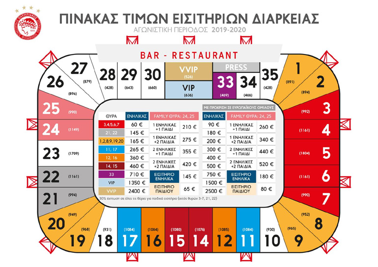 Οι τιμές κυμαίνονται από 60 ευρώ (στις Θύρες 3, 4, 5, 6 και 7) έως και 2400 ευρώ για τα VVIP. Οι κάτοχοι των καρτών διαρκείας της σεζόν που ολοκληρώθηκε θα έχουν δικαίωμα ανανέωσης από την Τρίτη 7 Μαΐου μέχρι και τις 5 Ιουνίου, ενώ στις 10 Ιουνίου αρχίζει η περίοδος αγοράς για τους νέους.
