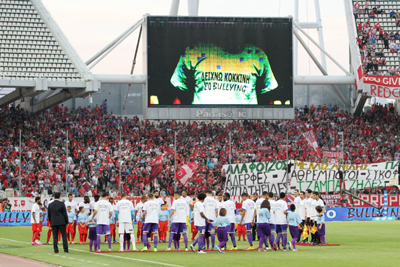5′ Διακοπή στο παιχνίδι για πανό που ανέβασαν οι οπαδοί του Ολυμπιακού.