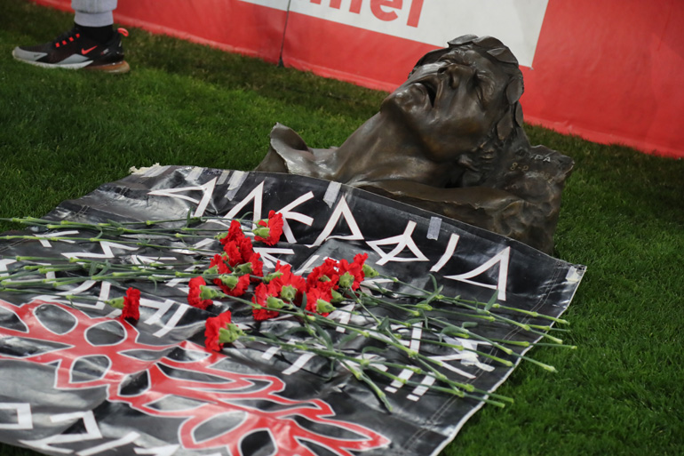 Παράλληλα, οι συγγενείς των 21 θυμάτων της τραγωδίας της Θύρας 7 απέτισαν φόρο τιμής μπροστά στο πανό που αναρτήθηκε εις μνήμη των θυμάτων.