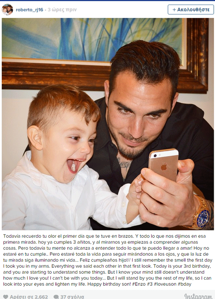 Τα τρία του χρόνια κλείνει σήμερα ο μικρός γιος του Ρομπέρτο και ο Ισπανός πορτιέρο, που δεν μπορεί να είναι κοντά στον πιτσιρικά, τού έστειλε ένα συγκινητικό μήνυμα μέσω instagram στο οποίο αναφέρει: