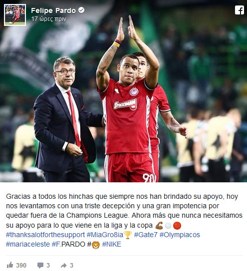 Ο Φελίπε Πάρντο μάλιστα, μέσω του λογαριασμού του στο Facebook, ζήτησε από τον κόσμο του Ολυμπιακού να στηρίξει ακόμα περισσότερο την ομάδα από δω και πέρα, προκειμένου να πετύχει τους στόχους της.
