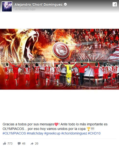 «Σας ευχαριστώ για τα μηνύματά σας. Πρώτα απ’ όλα, το πιο σημαντικό είναι ο ΟΛΥΜΠΙΑΚΟΣ. Γι’ αυτό σήμερα μένουμε ενωμένοι για το Κύπελλο», έγραψε χαρακτηριστικά ο Τσόρι.
