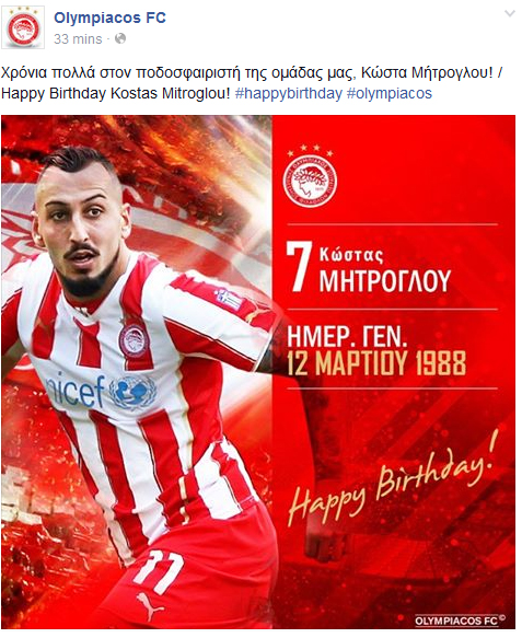 Ο Ολυμπιακός ευχήθηκε χρόνια πολλά στον Κώστα Μήτρογλου. Ο Έλληνας στράικερ κλείνει σήμερα τα 27 του χρόνια, καθώς είναι γεννημένος στις 12 Μαρτίου του 1988. Το μήνυμα των Πειραιωτών μέσω του facebook αναφέρει: «Χρόνια πολλά στον ποδοσφαιριστή της ομάδας μας, Κώστα Μήτρογλου!».