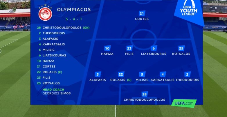Ολυμπιακός: Χριστοδουλόπουλος, Θεοδωρίδης (68′ Βασιλακόπουλος), Καρκατσάλης, Μίλισιτς, Ρολάκης, Αλαφάκης, Κότσαλος (26′ Κολοκοτρώνης), Χάμζα, Φίλης (46′ Πλις, 68′ Σιώζιος), Λιατσικούρας, Κορτές (77′ Τζαμαλής)