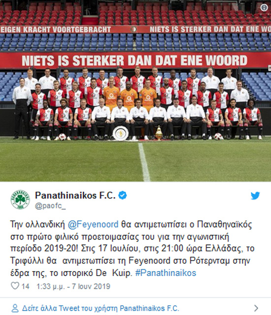 Την ολλανδική Feyenoord θα αντιμετωπίσει ο Παναθηναϊκός στο πρώτο φιλικό προετοιμασίας του για την αγωνιστική περίοδο 2019-20! Στις 17 Ιουλίου, στις 21:00 ώρα Ελλάδας, το Τριφύλλι θα αντιμετωπίσει τη Feyenoord στο Ρότερνταμ στην έδρα της, το ιστορικό De Kuip.