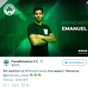 Παίκτης του Παναθηναϊκού είναι με κάθε επισημότητα πλέον ο Εμάνουελ Ινσούα, καθώς οι «πράσινοι» ανακοίνωσαν το βράδυ της Τετάρτης την απόκτηση του Αργεντινού αριστερού μπακ.