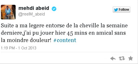 Μάλιστα ο Γαλλοαλγερινός μέσος, ο οποίος παράλληλα «πλήρωσε» την καθυστέρησή του στην προπόνηση της περασμένης Τρίτης, με τον αποκλεισμό του από το ματς Κυπέλλου με τον Εργοτέλη, με μήνυμά του στο twitter έδειξε έτοιμος να επανέλθει στα ματς του τριφυλλιού.