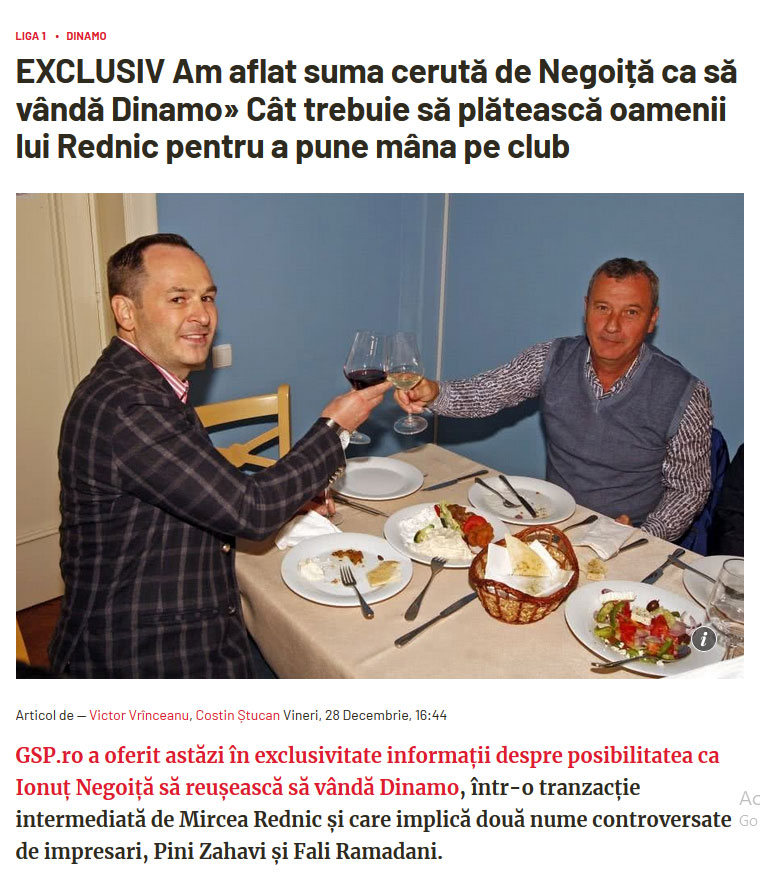 Σε διαπραγματεύσεις για την αλλαγή ιδιοκτησίας βρίσκεται η Ντινάμο Βουκουρεστίου. Ο τεχνικός της ομάδας της ρουμανικής πρωτεύουσας, Μίρτσεα Ρέντνιτς, είναι αυτός που μεσολαβεί για τις διαπραγματεύσεις του νυν ιδιοκτήτη, Ιουνούτς Νεγκόιτσα, με τους γνωστούς ατζέντηδες, Πίνι Ζάχαβι και Φάλι Ραμαντάνι.