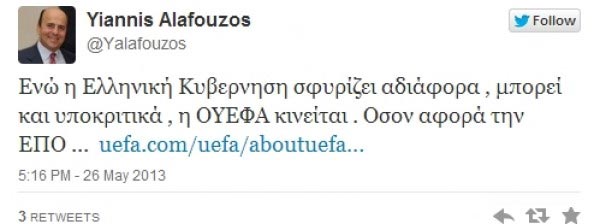 Ο πρόεδρος του Παναθηναϊκού, Γιάννης Αλαφούζος, μέσω του twitter άφησε αιχμές για την ΕΠΟ και την κυβέρνηση με αφορμή τις αποφάσεις της UEFA.