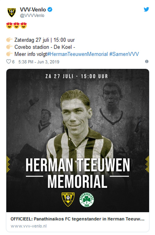 Όπως ανακοίνωσε τη Δευτέρα η ολλανδική ομάδα η αναμέτρηση κόντρα στο «τριφύλλι» θα διεξαχθεί στις 27 Ιουλίου, στη μνήμη του παλαίμαχου ποδοσφαιριστή, Χέρμαν Τόιβεν.
