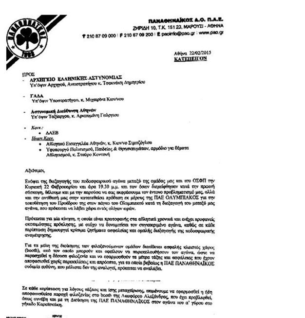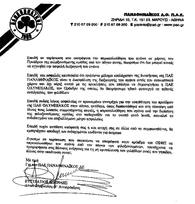 Επειδή και ασφαλώς κατανοείται οτι πρώτιστο μέλημα της διοικήσεως της ΠΑΕ Παναθηναϊκός είναι η διασφάλιση της διεξαγωγής του αγώνα εντός του αγωνιστικού χώρου και όχι πέριξ αυτού με τις προκλήσεις που επιλέγει να δημιουργήσει η ΠΑΕ Ολυμπιακός, τον πρόεδρο της οποίας θα θεωρήσουμε ηθικό αυτουργό σε πιθανές αντιδράσεις των φιλάθλων…
