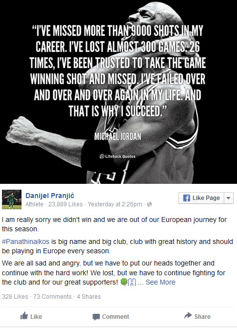 Μάλιστα η φωτογραφία με την οποία συνόδευε το μήνυμα του ο Πράνιτς ήταν μια του Μάικλ Τζόρνταν και μια δήλωση του κορυφαίου μπασκετμπολίστα ο οποίος είχε τονίσει: «Έχω χάσει περισσότερα από 9.000 σουτ στην καριέρα μου, έχω χάσει σχεδόν 300 παιχνίδια, 26 φορές μου είχαν εμπιστευθεί το νικητήριο σουτ και αστόχησα. Έχω αποτύχει ξανά και ξανά και ξανά στην ζωή μου. Αυτός όμως είναι και ο λόγος για τον οποίο πέτυχα».