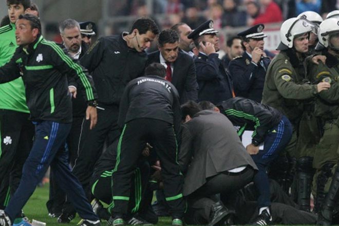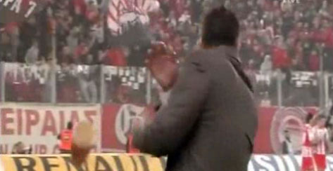 Πιο συγκεκριμένα, ο τεχνικός του «τριφυλλιού», δευτερόλεπτα μετά τον καταλογισμό πέναλτι στους «ερυθρόλευκους» κι ενώ διαμαρτυρόταν για την απόφαση του διαιτητή, δέχτηκε στο κεφάλι ένα κύπελλο με αναψυκτικό, προερχόμενο από τις «ακριβές» θέσεις του γηπέδου και όχι από την κερκίδα των φανατικών.