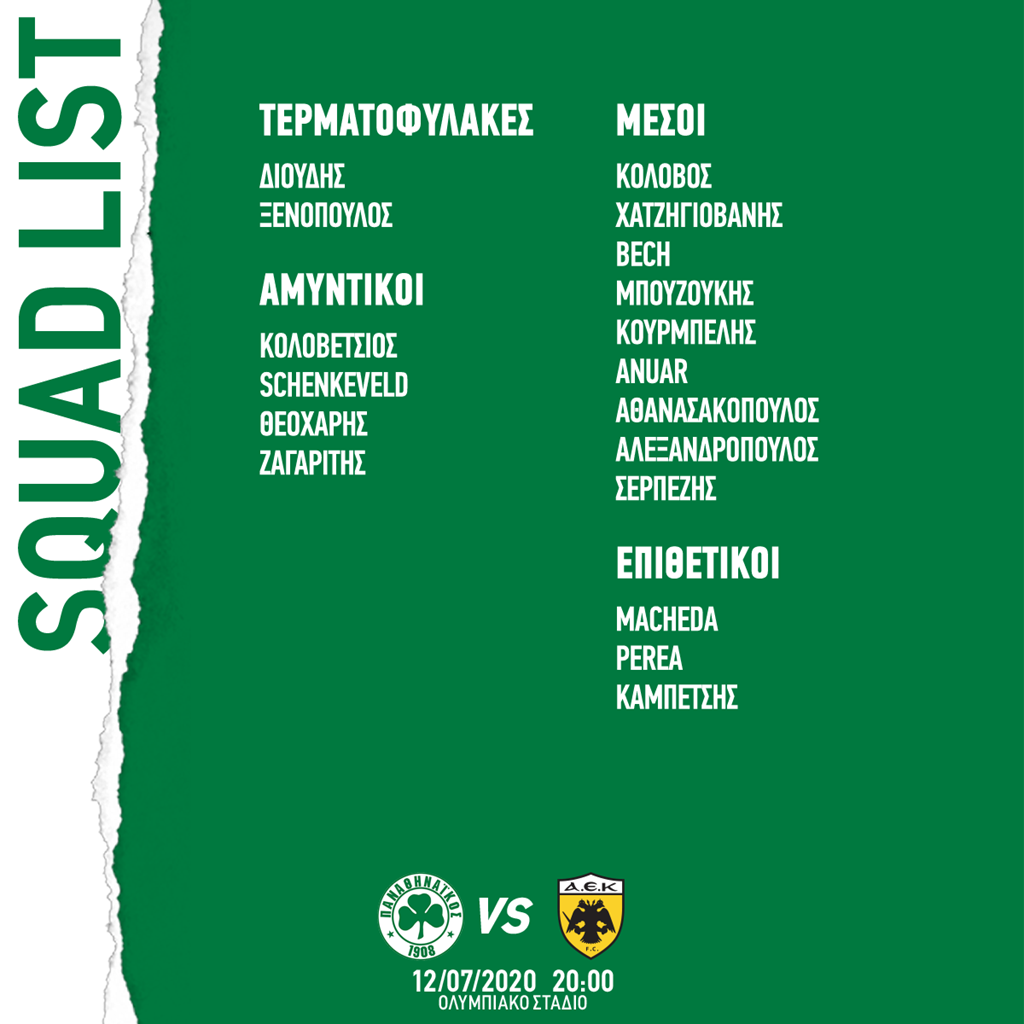 Στην αποστολή του τριφυλλιού επιστρέφει ο Κουρμπέλης, ο οποίος απουσίασε από το παιχνίδι με τον ΠΑΟΚ, λόγω καρτών, ενώ αντίθετα εκτός έμειναν ο Χατζηθεοδωρίδης, ο οποίος χάνει το υπόλοιπο των πλέι οφ, οι Νάγκι, Πούγγουρας (έκαναν ατομικό πρόγραμμα) αλλά και ο Κόναν.